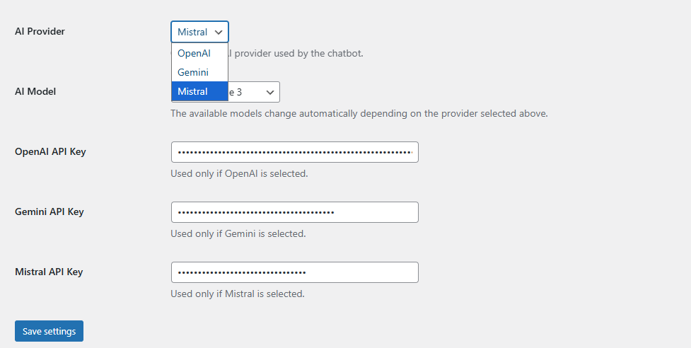 Choose your AI provider, add the API key, and save